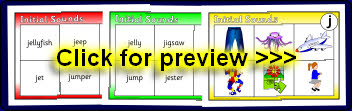 Printable bingo boards and picture cards where children match the pictures to the words featuring the initial sound ‘j’.