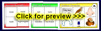 Printable bingo boards and picture cards where children match the pictures to the words featuring the initial sound ‘n’.
