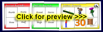 Printable bingo boards and picture cards where children match the pictures to the words featuring the initial digraph ‘th’.