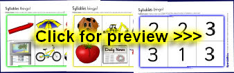 A set of printable bingo boards and cards for counting syllables in words. Children can match the numbers to the pictures or vice versa.