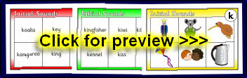 Printable bingo boards and picture cards where children match the pictures to the words featuring the initial sound ‘k’.
