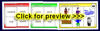 Printable bingo boards and picture cards where children match the pictures to the words featuring the initial sound ‘w’.