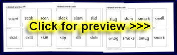 A set of flash cards (2 per A4 sheet) featuring final blends and accompanying pictures.