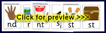 Printable bingo boards and picture cards where children match the pictures to the final blend/consonant cluster.