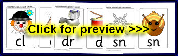 A set of flash cards (2 per A4 sheet) featuring initial blends and accompanying pictures.