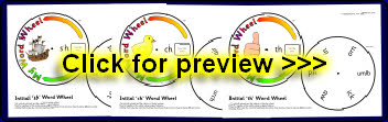 Printable word wheels making words beginning with sh, ch and th. Children first make the word to match the picture, then construct other words by turning the wheel.