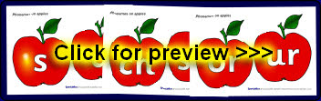 The phonemes as specified in the DfES ‘Letters and Sounds’ publication, presented on red apples. Great for a classroom ‘sound tree’ display.