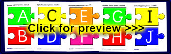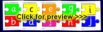A PDF document with the 26 lowercase alphabet letters presented on different coloured jigsaw pieces (2 per A4 page) These are prefect for use in large-scale word-construction and spelling games.