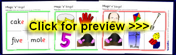 A set of printable bingo boards and cards using magic/modifying e words. The set consists of 4 different word boards and 4 different picture boards as well as picture and word cards. The game can be played by matching pictures to words, or words to pictures.
