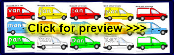 Words with the rime ‘an’ presented on coloured vans.