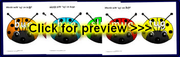 Words with the rime ‘ug’ presented on brightly coloured bugs.