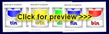 Words with the rime ‘in’ presented on paint tins.