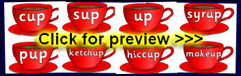 Words with the rime ‘up’ presented on cups.