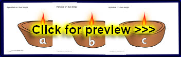 The lowercase alphabet letters presented on Diwali diva lamps.