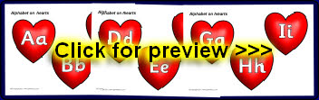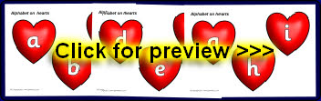 The uppercase and lowercase alphabet letters presented together on red hearts.