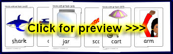 Printable flash cards featuring words with pictures that have the phoneme ‘ar’.
