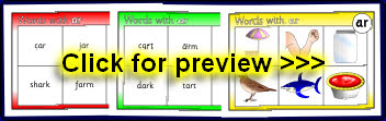 Printable bingo boards and picture cards where children match the pictures to the words with ‘ar’.