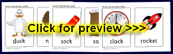 Printable flash cards featuring words with pictures that have the phoneme ‘ck’.