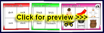Printable bingo boards and picture cards where children match the pictures to the words with ‘ck’.