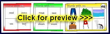 Printable bingo boards and picture cards where children match the pictures to the words with ‘ea’.