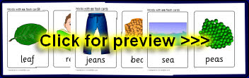 Printable flash cards featuring words with pictures that have the phoneme ‘ea’.