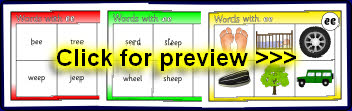 Printable bingo boards and picture cards where children match the pictures to the words with ‘ee’.