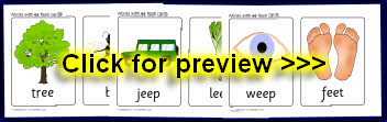 Printable flash cards featuring words with pictures that have the phoneme ‘ee’.