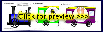 A printable train engine and carriages featuring pictures of objects that have the phoneme ‘ee’.