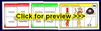 Printable bingo boards and picture cards where children match the pictures to the words featuring the initial sound ‘m’.