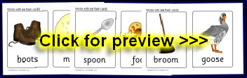 Printable flash cards featuring words with pictures that have the phoneme ‘oo’.