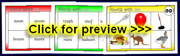 Printable bingo boards and picture cards where children match the pictures to the words with ‘oo’.