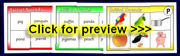Initial sounds bingo: p (Ref: SB6551) Printable bingo boards and picture cards where children match the pictures to the words featuring the initial sound ‘p’.