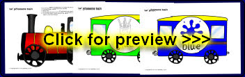 Phonics train: ue (Ref: SB4802) A printable train engine and carriages featuring pictures of things that have the phonemes associated with ‘ue’.