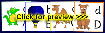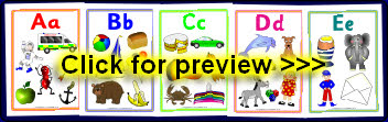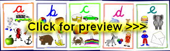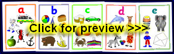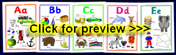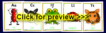 A set of fun A4-sized alphabet posters showing cartoon characters for each letter. Includes ant, cow, frog, kite, ladybird, pirate, worm and loads more colourful pictures! They can easily be resized to print multiple pages per sheet using Adobe Reader. This makes them perfect as flash cards as well.