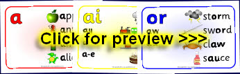 A set of A4 printable posters with ‘families’ showing various spelling patterns (graphemes) that make the same sound.