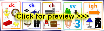 A set of A4-sized posters featuring digraphs with images and words that contain each digraph sound.