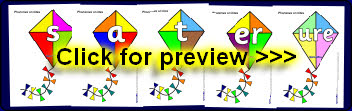 The lowercase phonemes, as specified in the DfES ‘Letters and Sounds’ publication, presented on brightly-coloured kites.