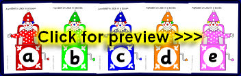 The lowercase alphabet letters presented on coloured Jack in a box toys.