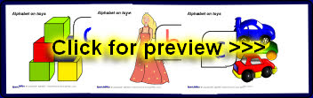 The 26 lowercase alphabet letters presented on toy images. 1 per A4 page.