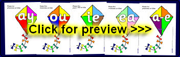 The lowercase Phase 5 phonemes, as specified in the DfES ‘Letters and Sounds’ publication, presented on brightly-coloured kites.