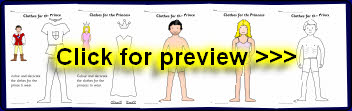 A set of printable sheets for children to colour, decorate or design clothes for the prince and princess.