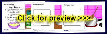 A useful set of visual aids showing how to make a porridge in 6 steps. It includes instructional text and a list of ingredients together with large, simple pictures.
