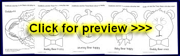 A set of simple printable sheets featuring images from the story of Goldilocks and the Three Bears for children to colour along with writing lines for story-related writing.