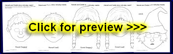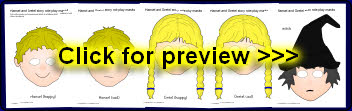 A fun set of printable Hanel and Gretel story masks for role-play. Simply print out, laminate, cut out and attach to lollipop sticks.