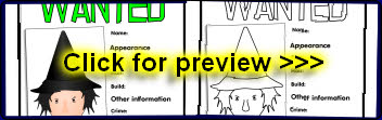 Printable wanted poster writing frames featuring a witch. Ideal for linking to various fairytale stories. Children can write descriptions of the witch and what reward can be claimed.