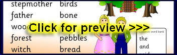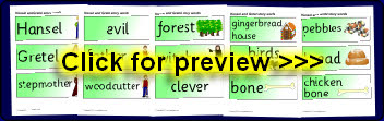 A set of printable word and picture cards linked to the story of Hansel and Gretel.