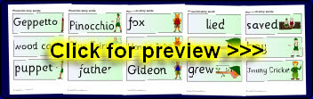 A set of printable word and picture cards linked to the story of Pinocchio.