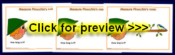A set of sheets showing Pinocchio with different length noses. These can be measured with rulers or non-standard measures such as cubes or paper clips.