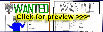 Printable wanted poster writing frames featuring a wolf. Ideal for linking to the stories of The Three Little Pigs or Little Red Riding Hood. Children can write descriptions of the wolf and what reward can be claimed.