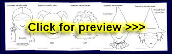 Simple printable black and white masks featuring characters from The Wizard of Oz.
